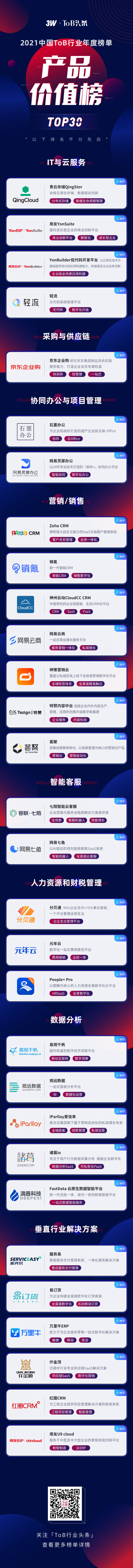 此次評(píng)選共歷時(shí)2個(gè)月,由「ToB行業(yè)頭條」聯(lián)手3W集團(tuán)、50+投資機(jī)構(gòu)及行業(yè)專家,從產(chǎn)品質(zhì)量、技術(shù)應(yīng)用、研發(fā)投入、用戶規(guī)模和產(chǎn)品復(fù)購(gòu)率等多個(gè)維度對(duì)參評(píng)產(chǎn)品進(jìn)行綜合評(píng)判,最終從報(bào)名及推薦參選的100多家產(chǎn)品中挑選出了最具市場(chǎng)價(jià)值的ToB產(chǎn)品TOP30。