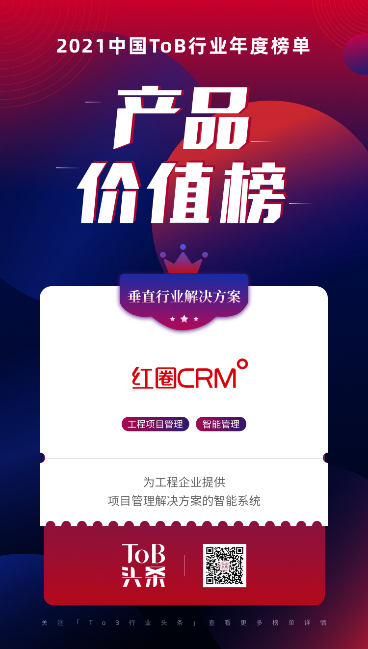 2022年1月4日,「ToB行業(yè)頭條」聯(lián)手3W集團(tuán)正式發(fā)布了《2021ToB行業(yè)年度榜單·產(chǎn)品價(jià)值榜》,紅圈CRM工程項(xiàng)目管理系統(tǒng)榮登最具市場(chǎng)價(jià)值的ToB產(chǎn)品TOP30榜單!