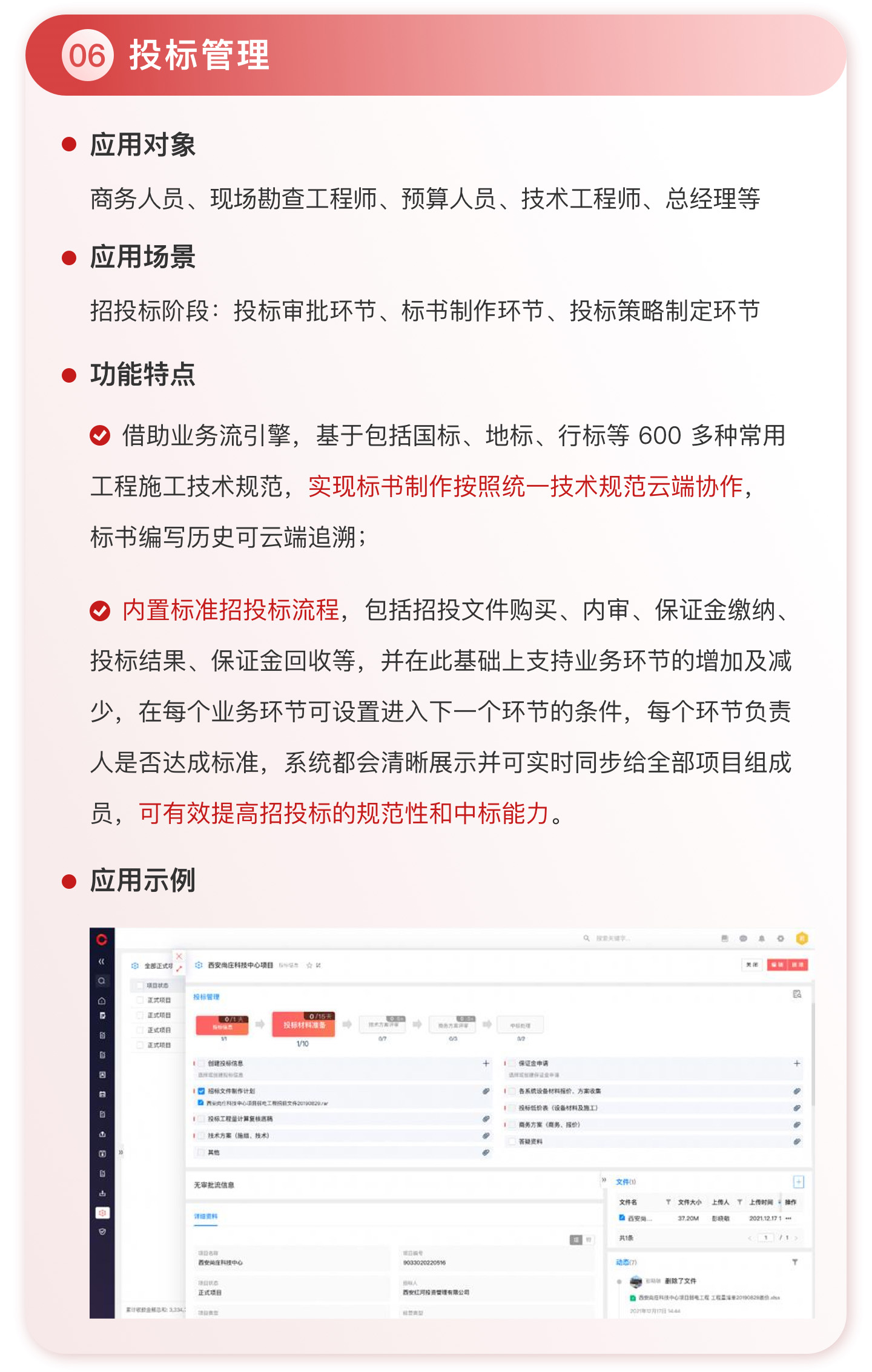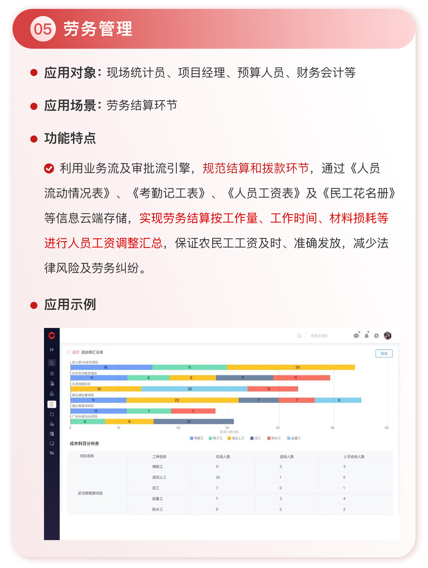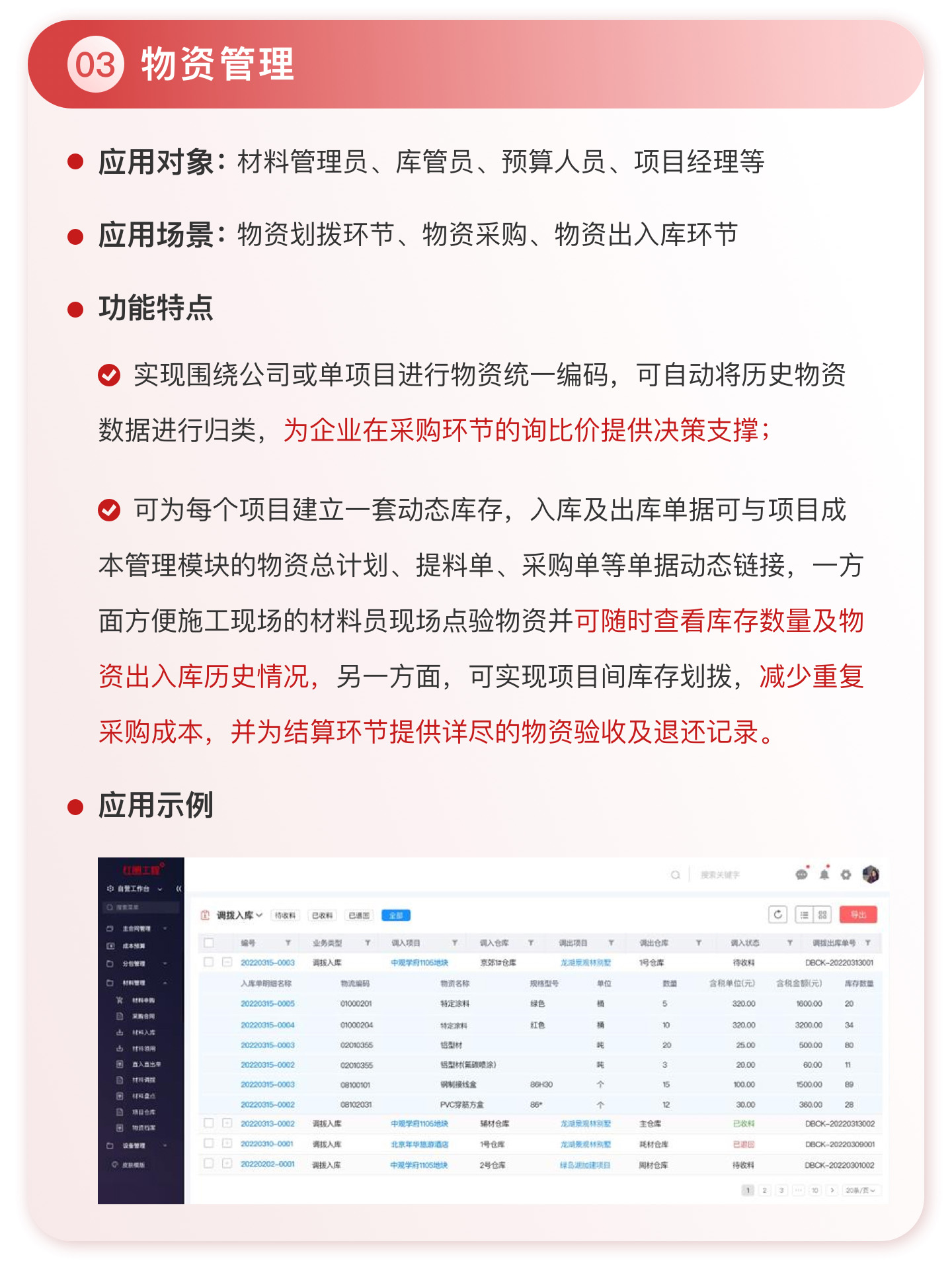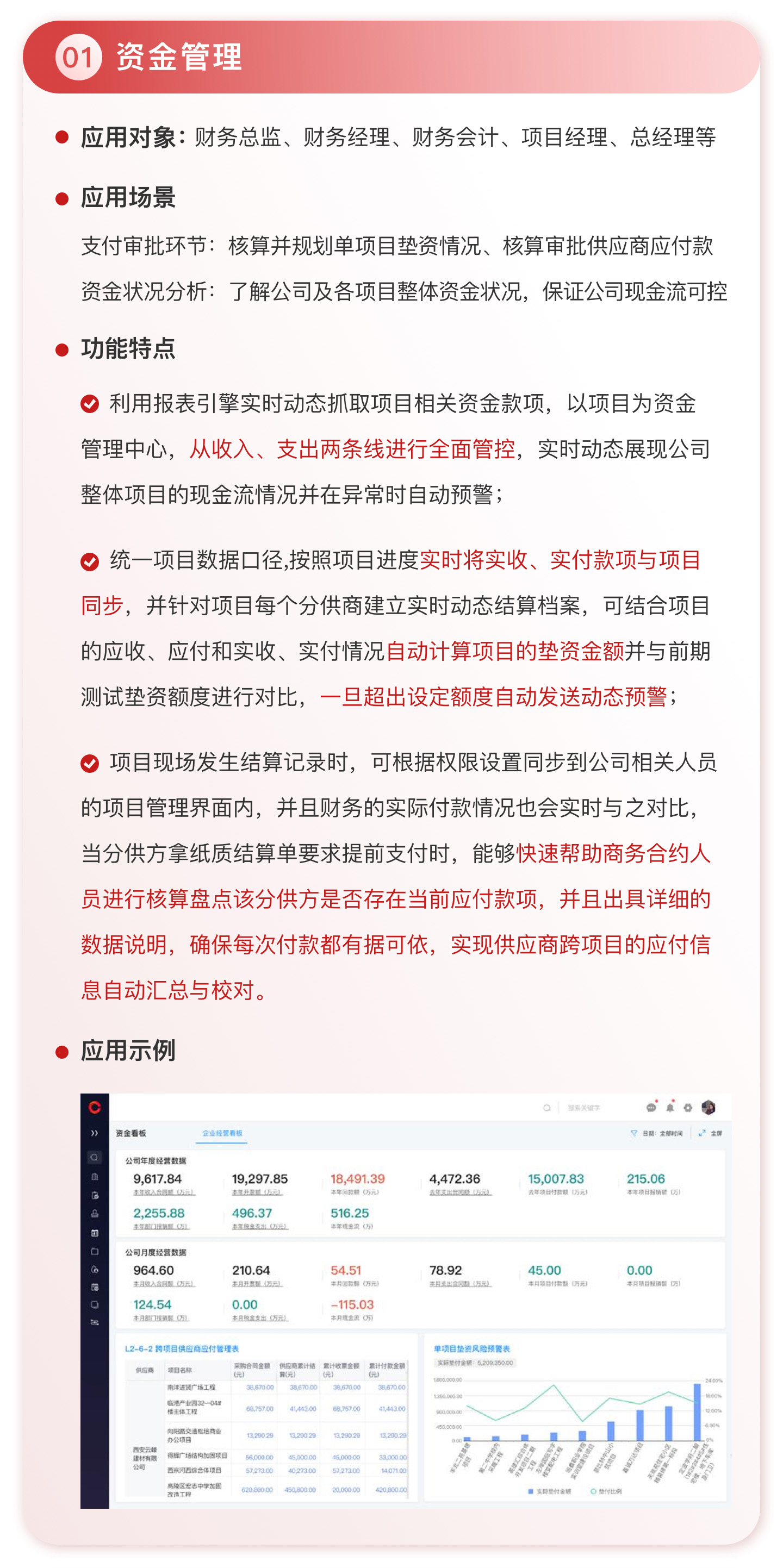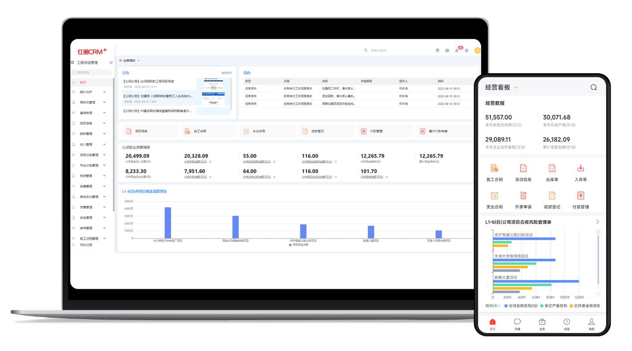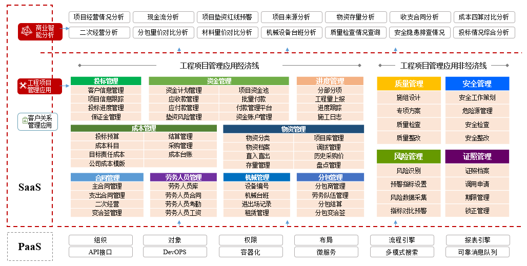 在工程項目管理領域,紅圈在 PaaS 平臺基礎上深入結合建筑工程企業(yè)的業(yè)務場景,針對其現(xiàn)金流管理薄弱、成本不可控、項目進度滯后、質量問題頻發(fā)和安全風險較多等痛點,通過資金管理、成本管理、物資管理、安全質量管理、投標管理、勞務管理、證照管理等功能模塊,使執(zhí)行人員業(yè)務流程標準化、透明化。