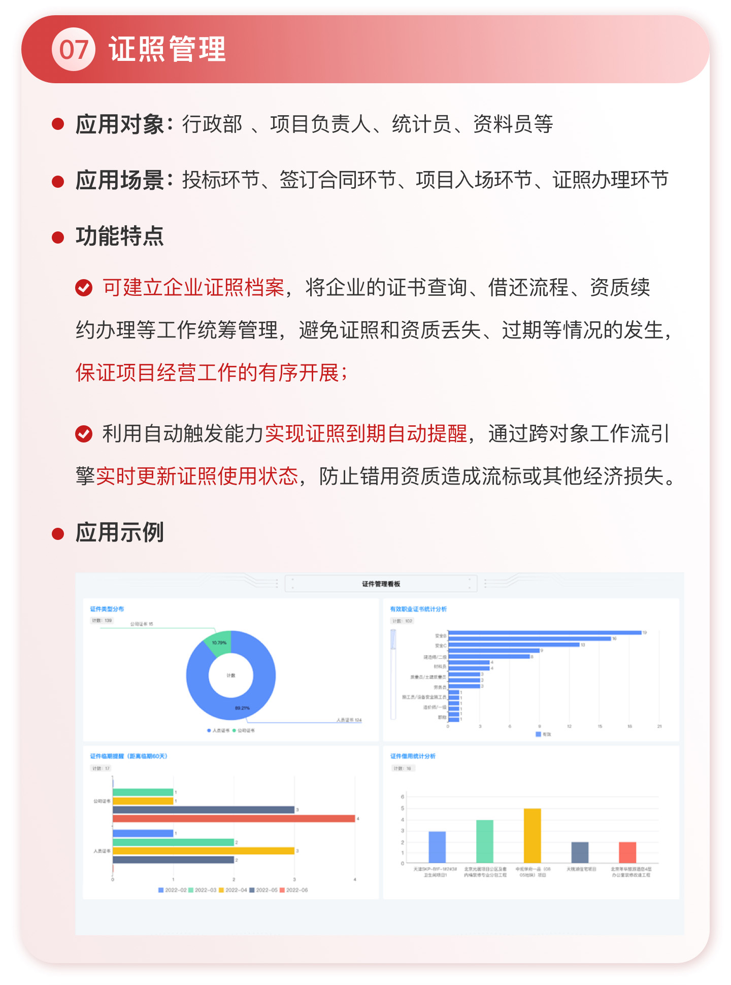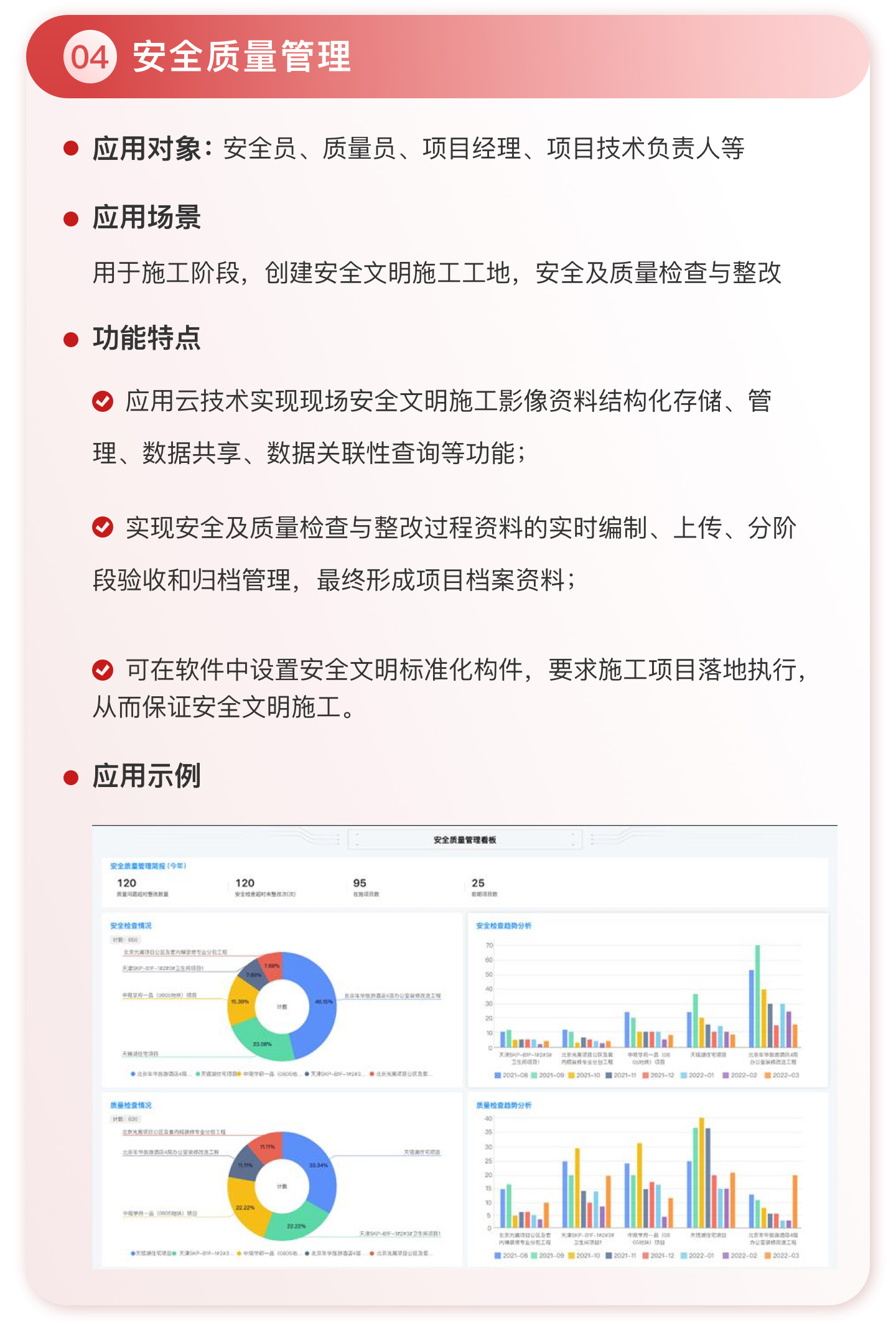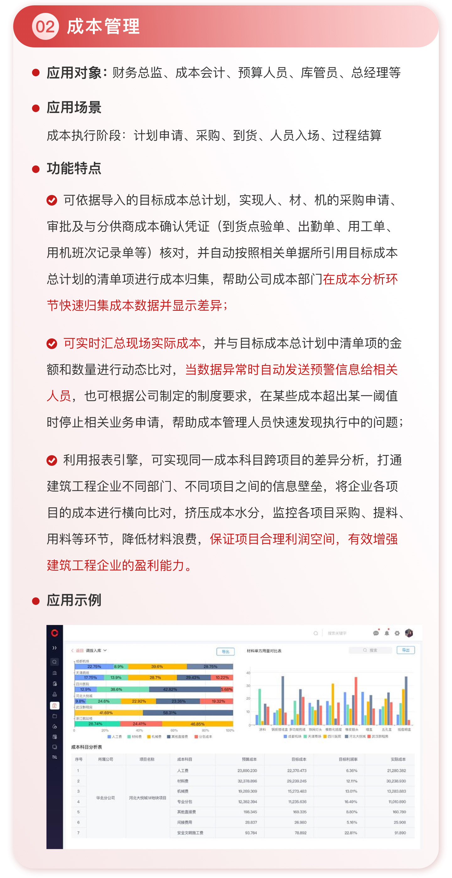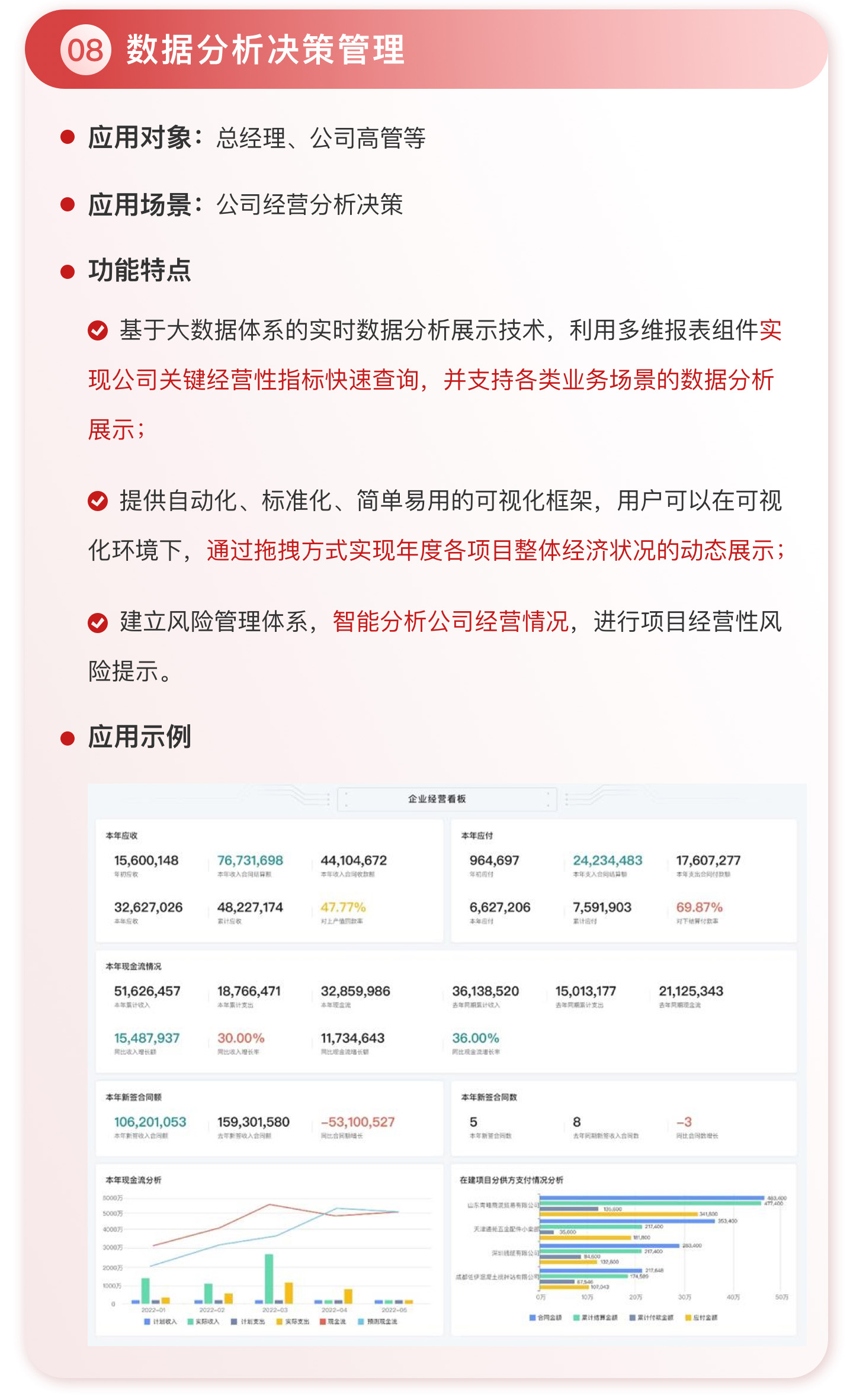 此外,紅圈系統(tǒng)能夠為建筑工程企業(yè)決策者實時呈現(xiàn)動態(tài)數(shù)據、提供智能數(shù)據分析,讓管理者實時了解項目的整體運營效率及效益是否達標、經營風險是否可控,滿足建筑工程企業(yè)數(shù)字化管理升級的需求,提升企業(yè)經營管理能力,實現(xiàn)工程項目施工全生命周期的降本增效。該產品主要應用于產值為 5,000 萬-20 億的建筑工程行業(yè)企業(yè)。
