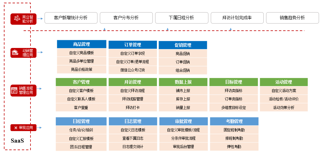 紅圈營銷+是一款兼顧通用協(xié)同辦公應用基礎上,主要為泛快消行業(yè)客戶提供客戶管理與銷售協(xié)同管理的客戶關系管理 SaaS 產品。產品具有進銷存管理、車銷管理、數(shù)據上報、營銷活動管理、目標管理等功能,幫助企業(yè)有效控制營銷費用和通路管理,提高銷售管理效率,為企業(yè)提供數(shù)據賦能,助力模式轉型。