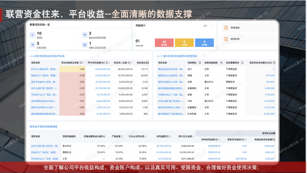 當前公司數(shù)字化程度較低,通過簡單的oa軟件、Excel表格、微信群、例會等傳統(tǒng)的管理方式進行管理。近幾年隨著公司省外業(yè)務(wù)的拓展,項目越來越大,傳統(tǒng)的低效管理模式已經(jīng)無法滿足日常的管理需求。公司聯(lián)營項目較多,個別項目出現(xiàn)資金挪用,虛開套現(xiàn),造成不必要的法律訴訟官司,甚至資金賬戶被凍結(jié)。此外,公司自營項目,人材機等各項成本,當前人工進行把控,項目利潤不達預期;人工進行統(tǒng)計,需要扒賬,實效性差,財務(wù)報表不能實時動態(tài)呈現(xiàn)。