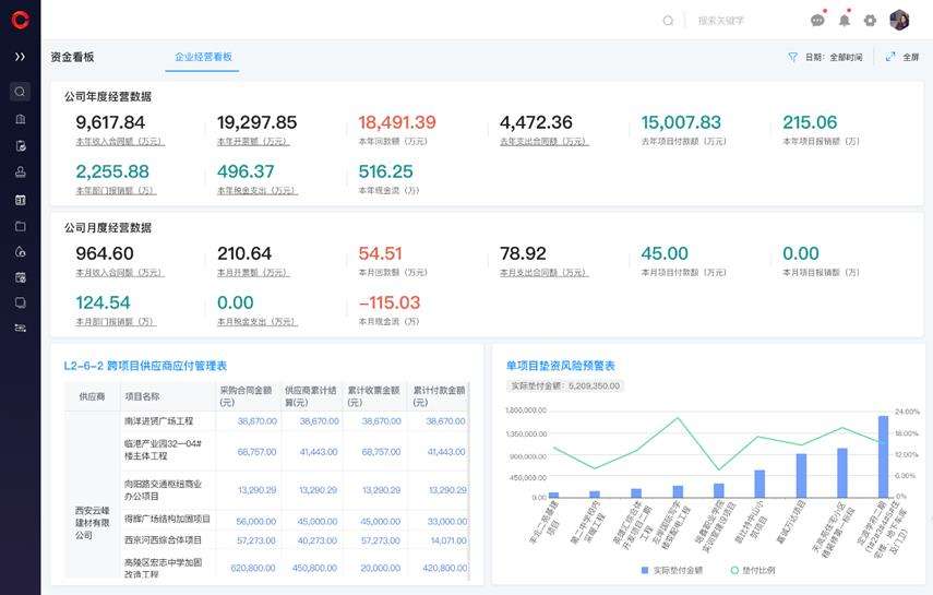 紅圈解決方案:紅圈系統(tǒng)具備全面的資金管理解決方案,通過系統(tǒng),老板能夠及時、準確地知道公司每個在建項目的應收和實收情況、供應商的結(jié)算情況,以及過程資料是否有缺失,從而評估是否可能產(chǎn)生額外墊資,判斷對下付款是否有必要做壓款,項目墊資是否存在風險。財務也可以通過數(shù)據(jù)來判斷風險,給到老板更好的建議。