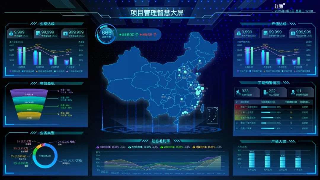 其中,紅圈即將上線的工程智慧大屏,可以集成多個業(yè)務版塊的數(shù)據(jù),如成本、進度、資金、合同、質安等,提供直觀、全面的數(shù)據(jù)展示,讓管理者免去手機操作、輕松獲取項目一攬信息,從而做出有效決策。