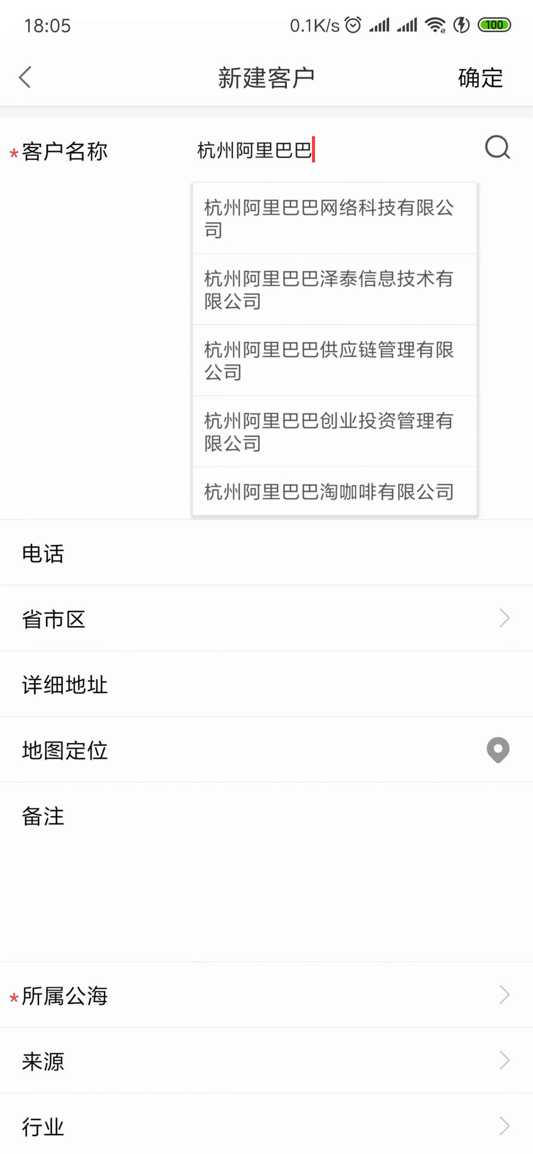 如輸入關(guān)鍵字“杭州阿里巴巴”后,系統(tǒng)將在下拉選項框中顯示抓取到的所有包含“杭州阿里巴巴”關(guān)鍵字的企業(yè)名稱,選擇相應(yīng)的企業(yè)名稱后,該企業(yè)的地址、注冊資本、法人等工商信息將全部呈現(xiàn)出來,銷售人員只需點擊“回填”,該企業(yè)的工商信息就能自動填充到系統(tǒng)中。此項功能將大大提高銷售線索/客戶信息創(chuàng)建的效率,并保證數(shù)據(jù)的準(zhǔn)確性,很好地解決銷售撞單、搶單等問題。