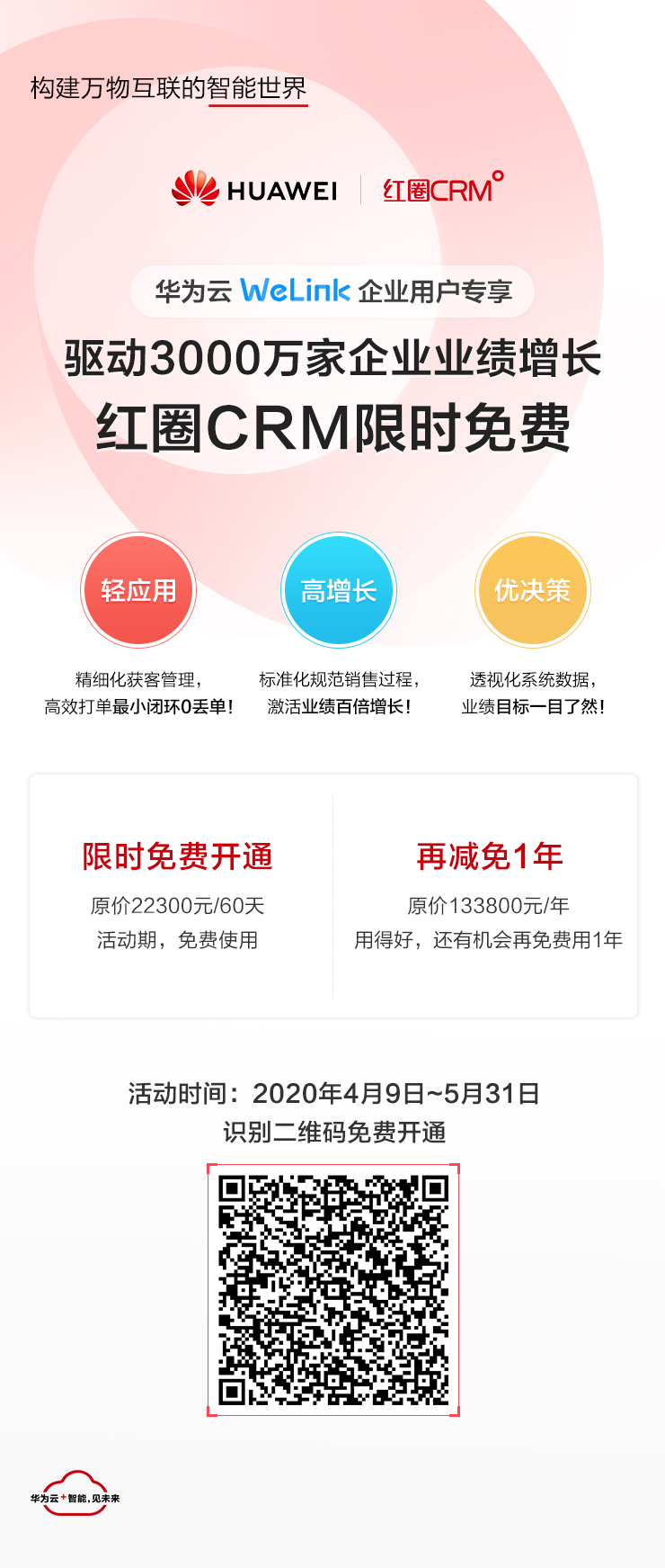 驅(qū)動(dòng)3000萬家企業(yè)業(yè)績百倍增長——紅圈CRM限時(shí)免費(fèi),#華為云WeLink#企業(yè)用戶專享,更有驚喜0元購活動(dòng)。