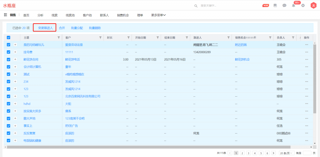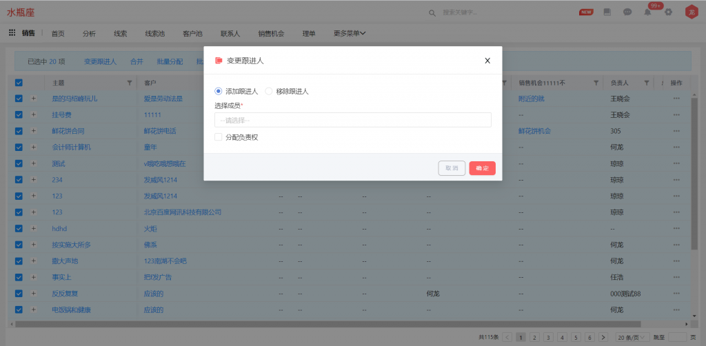 業(yè)務對象支持批量增加和刪除跟進人,同時增加“跟進人”字段,與跟進人組件同步,并支持篩選;使用前請先在對象管理中,將“跟進人”字段及“變更跟進人”按鈕的權限進行勾選