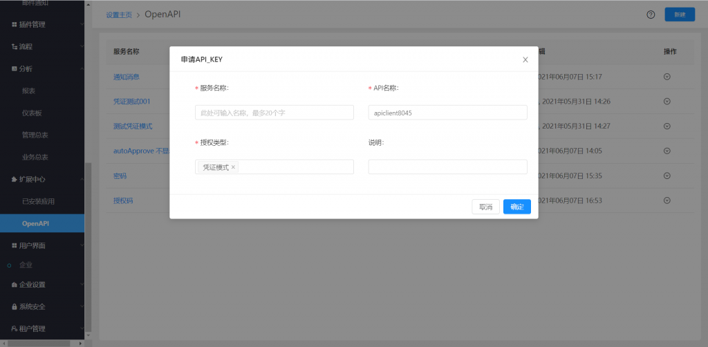 OpenAPI在功能開通后,用戶可以在后臺自行創(chuàng)建連接,生成密鑰