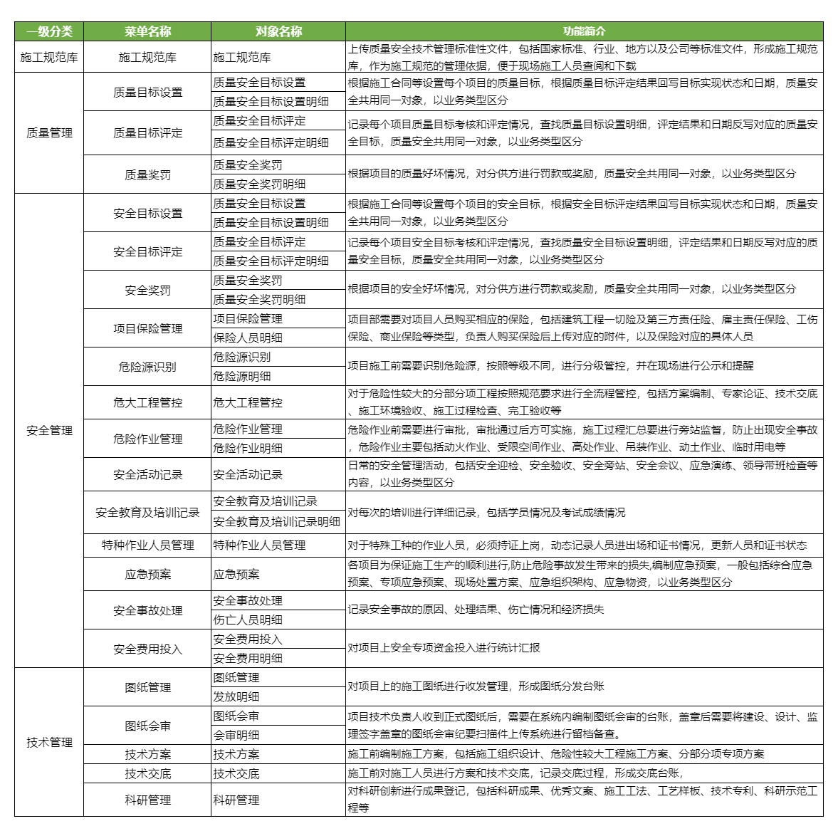 ● 工管理內(nèi)容主要針對大型總包項(xiàng)目施工現(xiàn)場業(yè)務(wù)管理,主要包括質(zhì)量、安全、技術(shù)管理,通過競品分析和客戶業(yè)務(wù)分析,梳理出通用性較強(qiáng)、使用較多的功能點(diǎn),滿足客戶對現(xiàn)場施工管理需求。