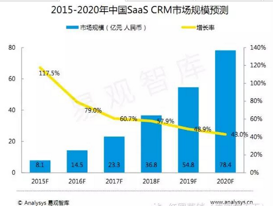 報告指出,國內(nèi)SaaS CRM市場在2014年的增長率達到了176.9%,市場規(guī)模從1.3億元人民幣增長到了3.7億元人民幣,2015年的增長率預(yù)計達到117.5%,市場規(guī)模增長到8.1億元人民幣。2015-2020年市場還會保持較高速度增長,但是隨著市場規(guī)模的逐漸擴大,增長將趨于平穩(wěn),中國傳統(tǒng)中小企業(yè)的互聯(lián)網(wǎng)化轉(zhuǎn)型將成為市場規(guī)模增長的主要動力,而隨著中國傳統(tǒng)中小企業(yè)互聯(lián)網(wǎng)化轉(zhuǎn)型的逐漸完成,SaaS CRM市場的企業(yè)數(shù)量將保持在一個平穩(wěn)的水平,市場的規(guī)模增長將來源于更加專業(yè)以及更加多元化的產(chǎn)品服務(wù)。