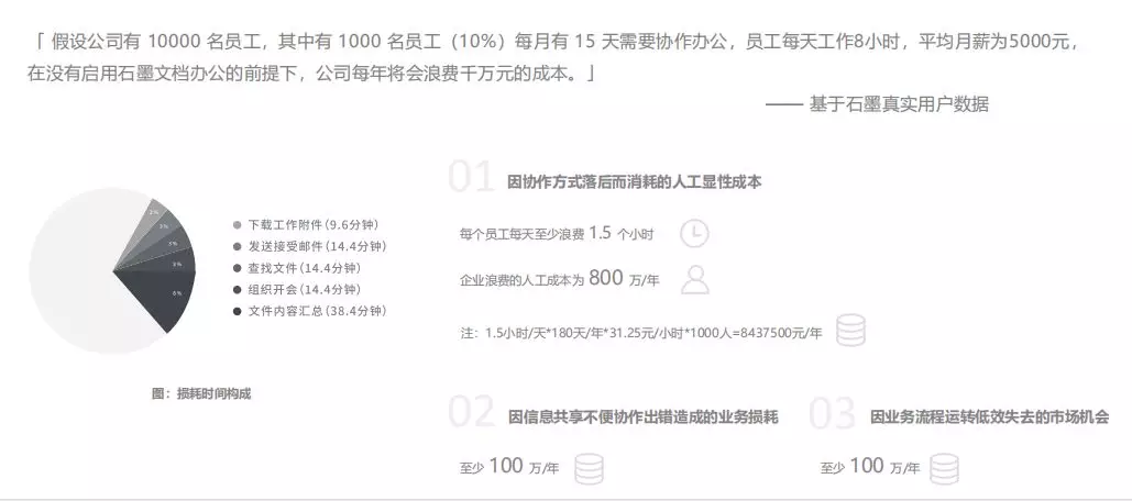 集腋成裘,員工每天花費在傳輸文件、查找文件、內(nèi)容匯總、文件傳輸上的時間并不是個小數(shù)目。對于一家10000 人規(guī)模的企業(yè)來說,每天至少要耗費 90 分鐘的無效時間,這直接導致企業(yè)每年需要付出將近 800 萬元的無效成本。