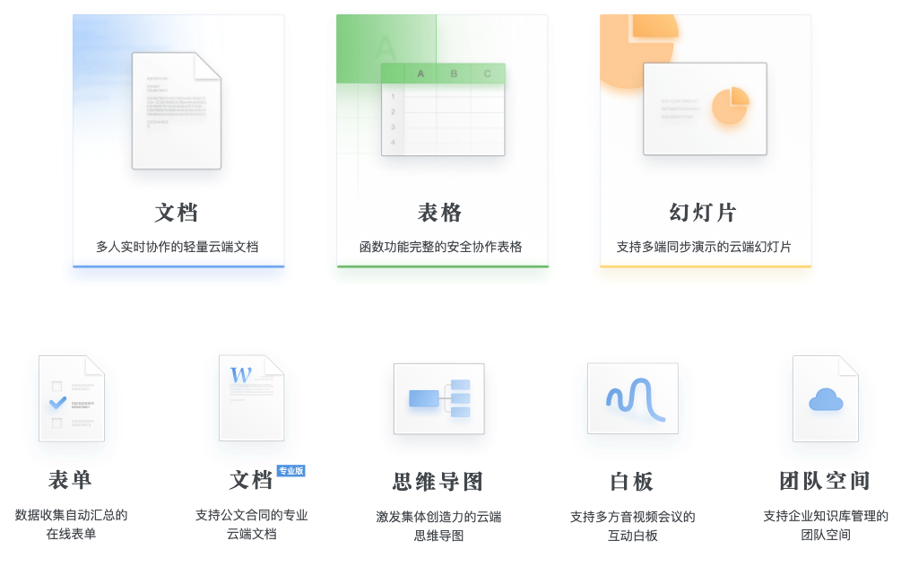 石墨文檔發(fā)展至今,已有產(chǎn)品線包含文檔、表格、表單、幻燈片、思維導圖、白板、團隊空間等,基本可以滿足企業(yè)辦公場景中的常見需求。