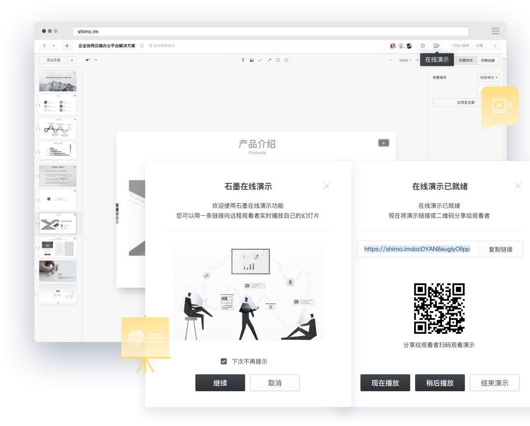 石墨還提供支持多人協(xié)作的幻燈片,團隊成員可通過二維碼、鏈接分享給觀眾,無論身在何方,演示時觀眾只需打開電腦、手機、Pad 等設(shè)備就能實時同步播放,即使遠隔萬里也如同在一個會議室面對面交流。