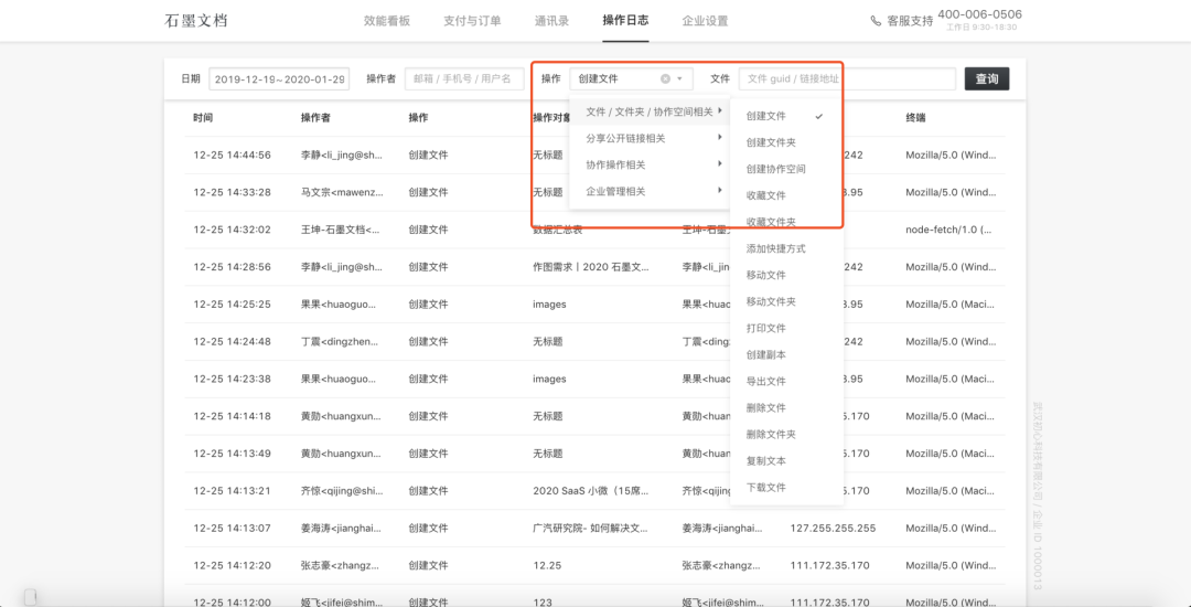 企業(yè)高級版中的「操作日志」可以幫助企業(yè)實時查詢文件的操作動態(tài)。