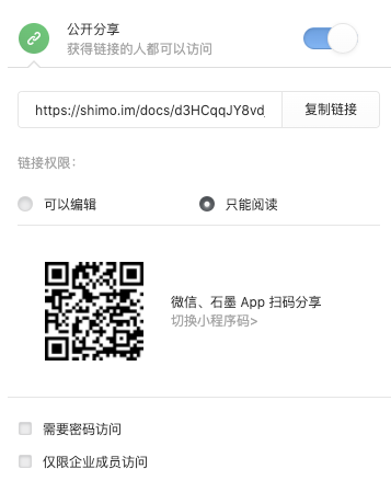 設(shè)置文檔公開分享時,可在石墨中設(shè)置“需要密碼訪問”或“僅限企業(yè)成員訪問”,從而實現(xiàn)文檔的定點定向傳輸,并可有效杜絕內(nèi)部文檔外泄。