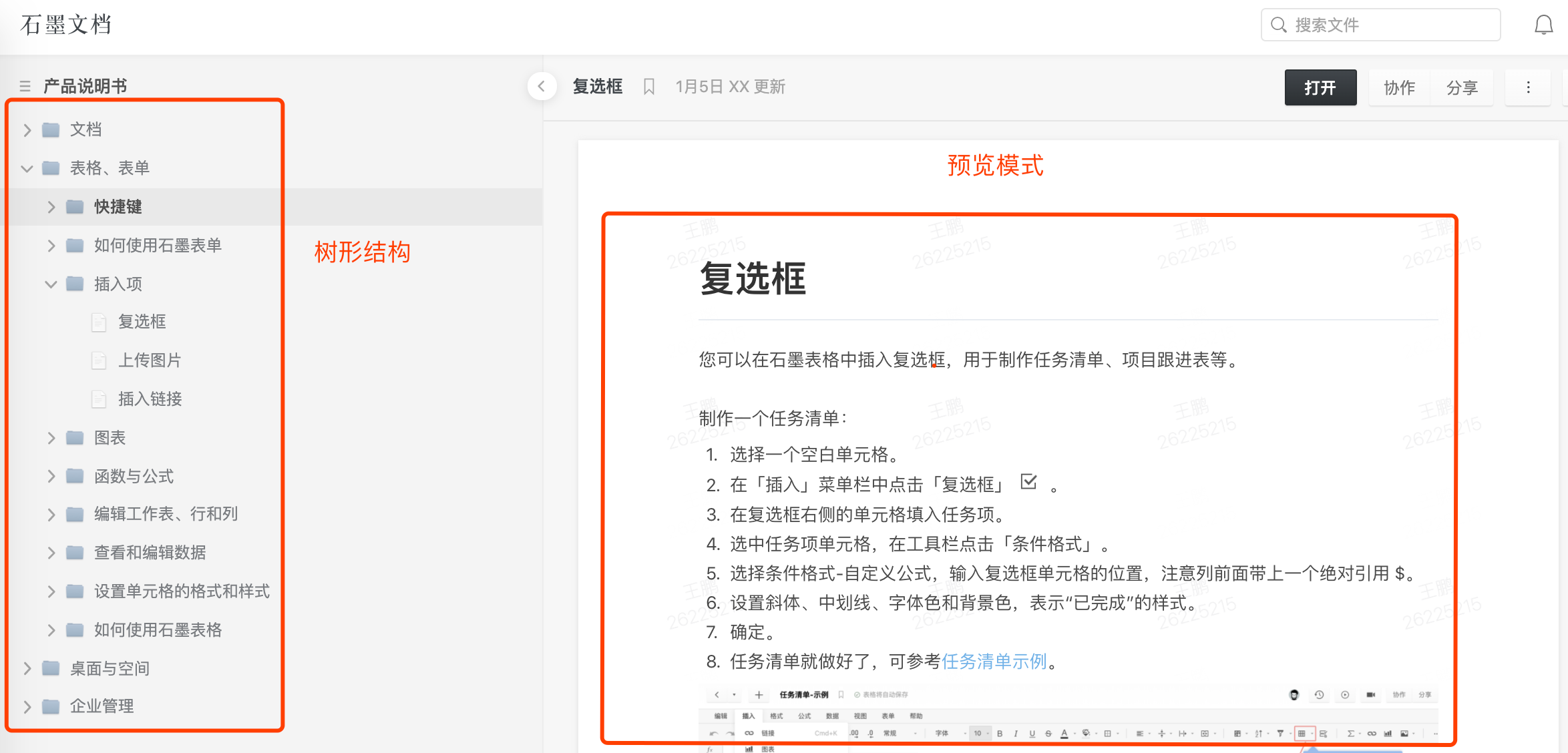 石墨的樹形結(jié)構(gòu)還提供預覽模式,用戶可直接在左側(cè)的空間目錄點擊文件夾或文件,右側(cè)實時預覽,查看文件內(nèi)容。