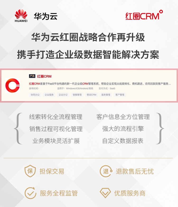 日前,繼2019年作為首批加入華為云WeLink的生態(tài)伙伴和唯一CRM系統(tǒng)服務(wù)商后,紅圈與華為云戰(zhàn)略合作持續(xù)升級(jí),再次在華為云嚴(yán)選商城發(fā)布了紅圈 CRM企業(yè)級(jí)移動(dòng)銷售自動(dòng)化管理系統(tǒng)。旨在基于華為云整體公有云解決方案的基礎(chǔ)上,為中大型企業(yè)、集團(tuán)公司用戶提供更加優(yōu)質(zhì)的數(shù)據(jù)智能解決方案,幫助企業(yè)實(shí)現(xiàn)從線索轉(zhuǎn)化、商機(jī)跟進(jìn)、合同回款到客戶服務(wù)的LTC全流程精細(xì)化管理,提升企業(yè)競爭力,推動(dòng)企業(yè)業(yè)績?cè)鲩L。