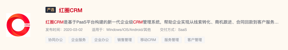 紅圈CRM是基于紅圈獨(dú)立研發(fā)的PaaS平臺(tái)上構(gòu)建的企業(yè)級(jí)SaaS移動(dòng)銷售管理云服務(wù)系統(tǒng),具備高度的靈活擴(kuò)展能力,能夠幫助企業(yè)實(shí)現(xiàn)從線索轉(zhuǎn)化、商機(jī)跟進(jìn)到回款管理等LTC銷售全流程的精準(zhǔn)管理,有效支撐企業(yè)復(fù)雜的業(yè)務(wù)場景需求及業(yè)務(wù)變化。通過面向客戶業(yè)務(wù)的數(shù)字化升級(jí)需求場景構(gòu)筑了在移動(dòng)辦公、溝通協(xié)作、銷售與營銷等業(yè)務(wù)場景解決方案,幫助企業(yè)實(shí)現(xiàn)了高效的團(tuán)隊(duì)協(xié)作,大幅提升了組織效能,更加全面地推進(jìn)了業(yè)務(wù)進(jìn)步。