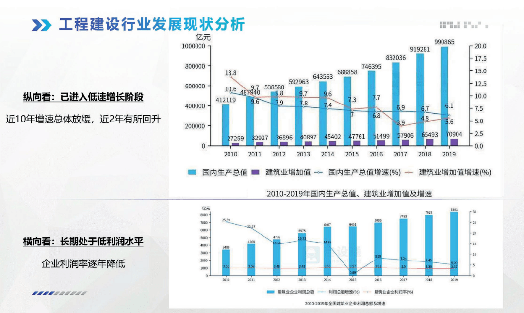 經(jīng)過(guò)對(duì)近十年數(shù)據(jù)的對(duì)比分析,可以看出建筑業(yè)作為國(guó)民經(jīng)濟(jì)支柱產(chǎn)業(yè)之一,地位依舊穩(wěn)固。但是如何擺脫利潤(rùn)率偏低的現(xiàn)狀、如何提高企業(yè)競(jìng)爭(zhēng)力成為了當(dāng)今需要探討的問(wèn)題。