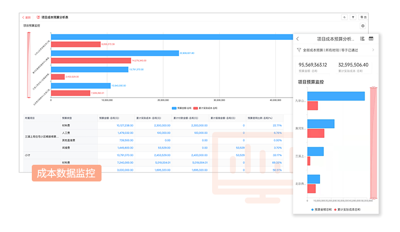 實時成本歸集,管理者可隨時掌握每一時點的收支、盈利狀況,即動態(tài)成本和動態(tài)利潤,并進行對比分析;成本數(shù)據(jù)可鉆取查詢,想看任何一項數(shù)據(jù)都可直接追本溯源;成本預控預警,各項成本在預算控制中,施工過程中材料使用超標或者少于標準用量,系統(tǒng)自動觸發(fā)提醒,施工進度百分比一目了然。