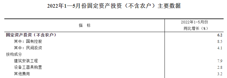 國家統(tǒng)計(jì)局發(fā)布數(shù)據(jù)顯示,1—5月份,全國固定資產(chǎn)投資(不含農(nóng)戶)205964億元,同比增長6.2%。其中,民間固定資產(chǎn)投資117128億元,同比增長4.1%。從環(huán)比看,5月份固定資產(chǎn)投資(不含農(nóng)戶)增長0.72%。