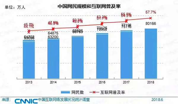 截至2018年6月,我國網(wǎng)民規(guī)模為8.02億,上半年新增網(wǎng)民2968萬人,較2017年末增加3.8%,互聯(lián)網(wǎng)普及率達57.7%。