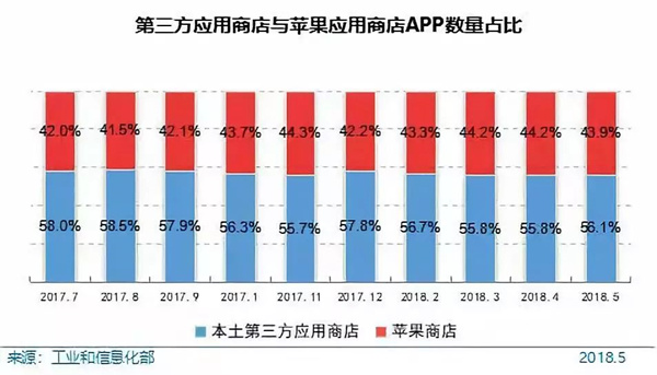 其中,我國本土第三方應(yīng)用商店移動應(yīng)用數(shù)量超過233萬款,占比為56.1%;蘋果商店(中國區(qū))移動應(yīng)用數(shù)量超過182萬款,占比為43.9%。
