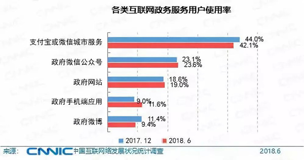 截至2018年6月,我國在線政務(wù)服務(wù)用戶規(guī)模達到4.70億,占總體網(wǎng)民的58.6%,有42.1%的網(wǎng)民通過支付寶或微信城市服務(wù)平臺獲得政務(wù)服務(wù)。