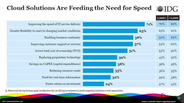 76%的大型企業(yè)正在尋求云應(yīng)用和平臺以加速IT服務(wù)的交付。多年來,云計算已經(jīng)被視作是一個降低成本的優(yōu)先策略,現(xiàn)在它已經(jīng)成為數(shù)字化業(yè)務(wù)模式的推動者。IT部門要求快速交付云應(yīng)用及平臺組件的期望與壓力從未如此之高。而云投資的目的是為企業(yè)帶來更大的靈活性,以及它們對不斷變化的市場環(huán)境做出反應(yīng)的能力(63%的全體受訪者對此表示同意),從而推進(jìn)數(shù)字化業(yè)務(wù)模式的實現(xiàn)。