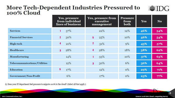 在所有行業(yè)中,制造業(yè)、高科技和電信/公共事業(yè)從業(yè)者面臨著最大的高層壓力,他們被要求實現(xiàn)100%的云計算。簡化復(fù)雜的制造過程,并提供一個從車間到公司頂層的統(tǒng)一記錄系統(tǒng)的綜合云平臺,是上述三個技術(shù)驅(qū)動型行業(yè)高管管理的重中之重。而實現(xiàn)更好的供應(yīng)商質(zhì)量管理、可見性、更好的制造計劃、工作流優(yōu)化、實現(xiàn)和客戶交付是云平臺能促進(jìn)制造業(yè)增長的數(shù)個領(lǐng)域。