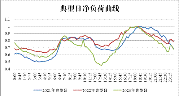 由于湖南光伏發(fā)電裝機的快速增長,湖南電網(wǎng)凈負(fù)荷曲線(電網(wǎng)凈負(fù)荷=電網(wǎng)負(fù)荷-新能源出力-外受電)產(chǎn)生向“鴨子型曲線”轉(zhuǎn)變的趨勢(見圖),午間腰荷時段凈負(fù)荷越來越低,該時段可再生能源消納困難情況開始顯現(xiàn)。以2023年某日為例,該日光伏發(fā)電出力較大,腰荷時段電網(wǎng)凈負(fù)荷較前兩年同期明顯下降,同時低于當(dāng)日低谷時段凈負(fù)荷,導(dǎo)致腰荷時段新能源消納更為困難。