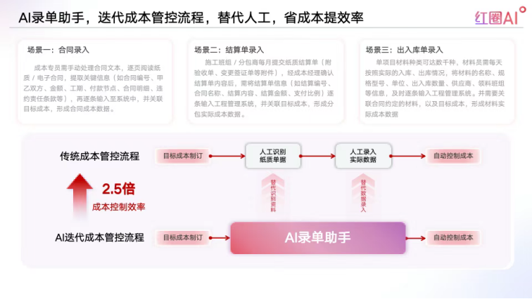 面對(duì)這些困境,工程企業(yè)需要的不是 “零散的數(shù)字化工具”,而是一套能打通數(shù)據(jù)、沉淀知識(shí)、賦能決策的完整解決方案。紅圈工程管理系統(tǒng)以 “數(shù)據(jù)驅(qū)動(dòng)、AI 賦能決策” 為核心理念構(gòu)建的 “智慧工程大腦”,正是為破解這些難題而來。