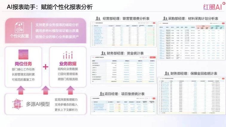 過去,財(cái)務(wù)、經(jīng)營、項(xiàng)目等部門要花幾天時(shí)間做報(bào)表,結(jié)果還只是 “數(shù)據(jù)的堆砌”;現(xiàn)在,AI 報(bào)表助手能自動(dòng)生成多維度管理報(bào)表,比如材料采購計(jì)劃分析、項(xiàng)目墊資統(tǒng)計(jì)、聯(lián)營管理費(fèi)分析等,還能自定義配置報(bào)表維度,滿足不同崗位的需求。更進(jìn)階的是 “項(xiàng)目 360°AI 解讀”:系統(tǒng)會(huì)綜合項(xiàng)目的進(jìn)度、成本、質(zhì)量、安全數(shù)據(jù),自動(dòng)對(duì)比目標(biāo)與實(shí)際的差異 —— 比如發(fā)現(xiàn)某項(xiàng)目成本超支,會(huì)精準(zhǔn)定位是 “材料價(jià)格上漲” 還是 “用量超標(biāo)”;還能預(yù)警潛在風(fēng)險(xiǎn),比如 “某項(xiàng)目進(jìn)度滯后可能影響現(xiàn)金流”,并給出調(diào)整建議。