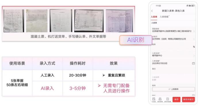 數(shù)據(jù)的源頭是業(yè)務(wù)單據(jù),錄入的繁瑣與錯(cuò)誤是成本失控的隱患之一。紅圈AI系列智能產(chǎn)品中的AI錄單助手作為企業(yè)的“智能掃描儀”,能通過大模型自動(dòng)識(shí)別混凝土票、送貨單、手寫確認(rèn)單乃至合同等各類單據(jù),實(shí)現(xiàn)從圖像識(shí)別到高質(zhì)量系統(tǒng)錄入的秒級(jí)閉環(huán),可減少90%人工操作。它不僅能提取關(guān)鍵字段,更能智能匹配合同明細(xì)、關(guān)聯(lián)歷史數(shù)據(jù),讓成本歸集更智能、溯源更方便,從而迭代了整個(gè)成本管控流程。