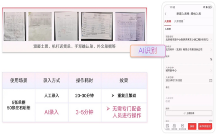 在工地,比扛鋼筋更累的是錄單據(jù)——合同、結(jié)算單、出入庫單,年輕技術(shù)員每天花幾小時對著紙質(zhì)單據(jù)敲鍵盤,枯燥易錯,毫無成就感。紅圈AI深刻理解這些場景:成本專員需手動處理合同文本,逐頁閱讀并提取關(guān)鍵信息;施工班組每月提交的紙質(zhì)結(jié)算單需逐條輸入系統(tǒng);單項目材料種類可達數(shù)千種,材料員需每天及時逐條輸入出入庫信息。