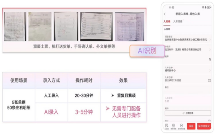 它靠大模型自動(dòng)識(shí)別各類單據(jù)——混凝土票、機(jī)打送貨單、手寫(xiě)確認(rèn)單,連外文單據(jù)都能秒讀。關(guān)鍵字段自動(dòng)提取,合同明細(xì)自動(dòng)匹配,系統(tǒng)數(shù)據(jù)自動(dòng)回填,減少90%的人工操作。入庫(kù)單進(jìn)來(lái),自動(dòng)分析該掛哪個(gè)合同、哪項(xiàng)成本;結(jié)算單進(jìn)來(lái),自動(dòng)歸集實(shí)際成本,溯源到每一筆采購(gòu)。以前材料員錄單錄到眼花,現(xiàn)在“掃一掃”就完事。
