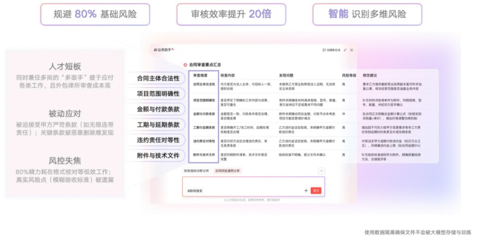 有了這“全景圖”,紅圈AI報(bào)表助手如虎添翼。它像“部門的智能分析官”,拿到報(bào)表后,大模型自動(dòng)定位異常指標(biāo)、生成根因解讀與改善建議,三句話把核心問題說(shuō)清楚,整合各種風(fēng)險(xiǎn)。和其打配合的還有紅圈AI業(yè)務(wù)助手,實(shí)時(shí)解析工程管理業(yè)務(wù)數(shù)據(jù),自動(dòng)生成風(fēng)險(xiǎn)預(yù)警及優(yōu)化建議,幫助規(guī)避80%基礎(chǔ)風(fēng)險(xiǎn),審核效率提升20倍。
