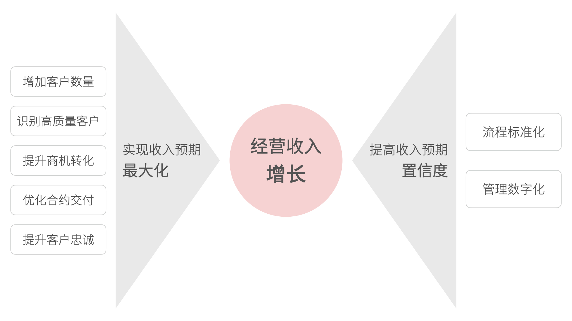 為了實現(xiàn)企業(yè)經營收入增長這個核心目標,CRM 軟件需要企業(yè)實現(xiàn)收入預期最大化和提高收入預期置信度。實現(xiàn)收入預期最大化這個目標可以從五個方面入手:增加客戶數量、識別高質量客戶、提升商機轉化、優(yōu)化合約交付、提升客戶忠誠。而提高收入預期置信度的本質是降低業(yè)務戰(zhàn)略執(zhí)行的不確定因素,從人治模式轉型為系統(tǒng)管理,即流程標準化和管理數字化。